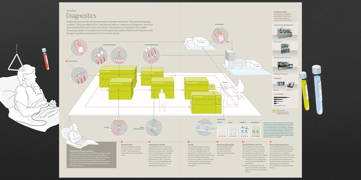 Drei Infografiken zu den Workflows «Life Sciences», «Forensics» und «Diagnostics»: Klassische Flussdiagramme wurden in szenische Modelle überführt, welche mit erklärenden Zooms, Produktbildstrecken und Textlegenden hohe Informationsdichten fassbar transportieren.