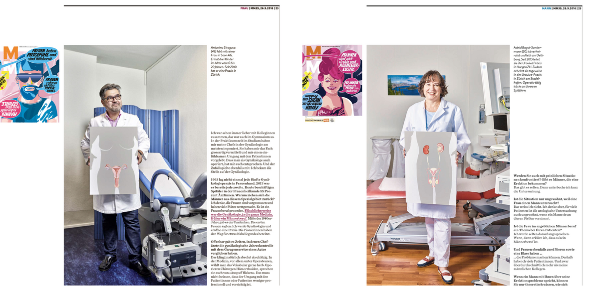 Medizinische Illustrationen für die Gender Ausgabe 2016 des Migros Magazins. Interview mit einer Gynäkologin im weiblichen und mit einem Urologen im männlichen Teil des Magazins. Die Organe der jeweiligen Fachgebiete erscheinen im Gestus anatomischer Schautafeln auf Silhouetten gemappt, welche die Portraitierten vor sich halten. Die Urologie beschäftigt sich mit den beide Geschlechter betreffenden harnbildenden und harnableitenden Organen; Niere, Harnblase, Harnleiter und Harnröhre. Sie umfasst zudem die Geschlechtsorgane des Mannes, also der Hoden, Nebenhoden, Samenleiter, Samenbläschen, Penis und Prostata. Zur Gynäkologie gehören Vulva und die inneren Geschlechtsorgane Vagina, Gebärmutter, Eileiter sowie die Eierstöcke.